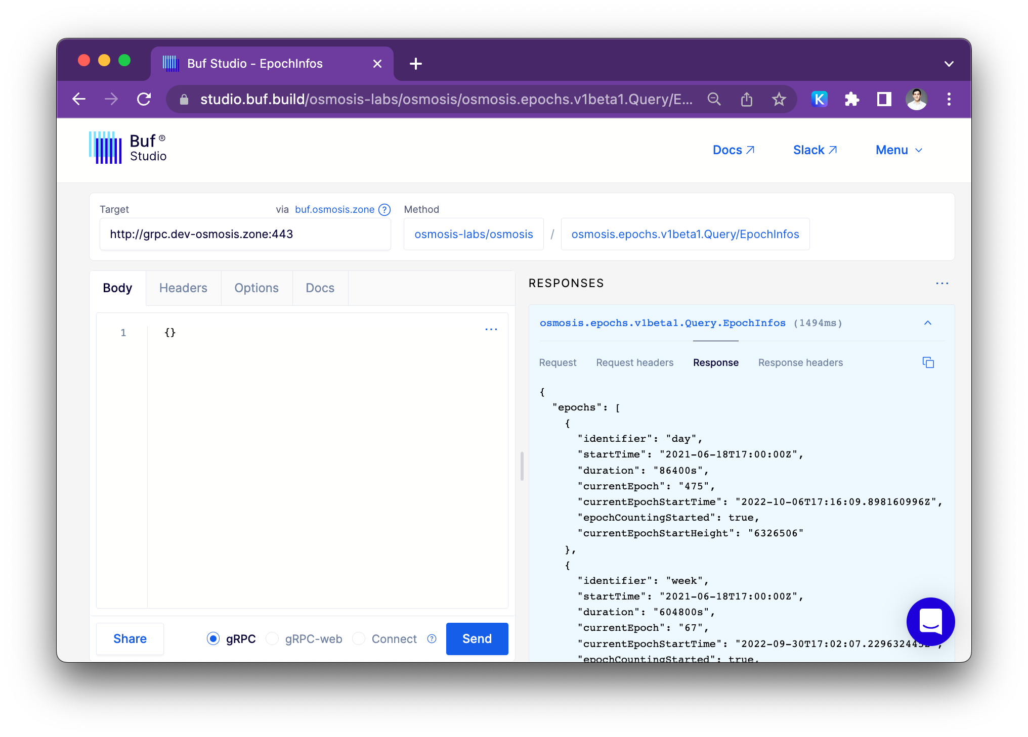 You can send requests to the gRPC server using a gRPC client such as grpcurl or from Buf Studio.